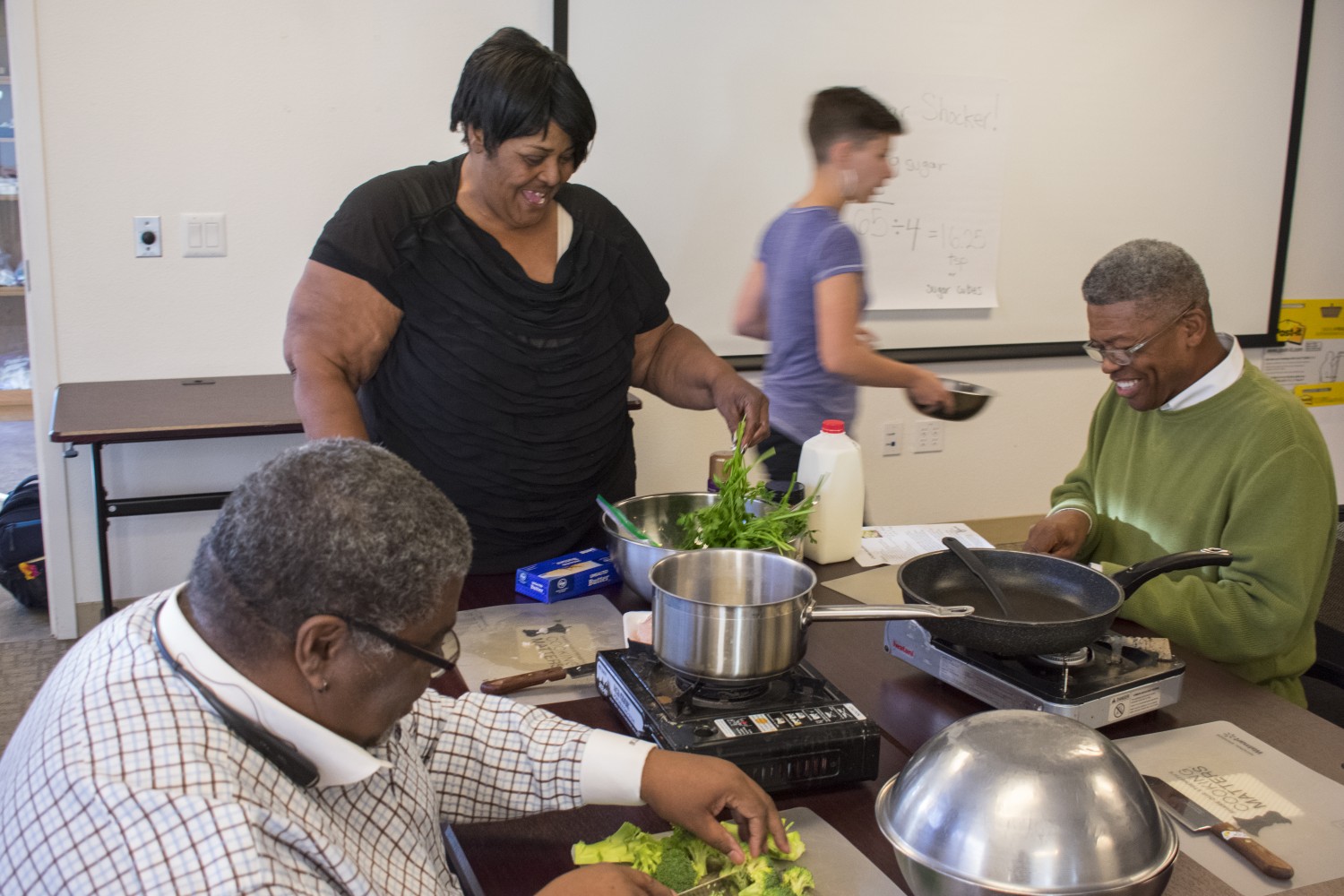 “In a typical class, we spend the first half on a nutrition lesson – identifying whole grains and counting calories, for example,” Clara says. “Then we have a Chef’s lesson that puts those facts into action.” Participants learn to cook using toaster ovens and portable stoves, as well as develop sous-chef skills like proper knife technique and measurement skills.