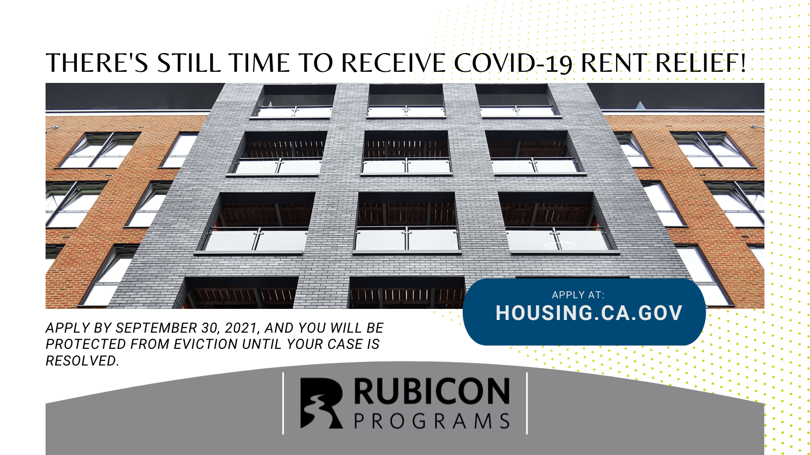 If you're having trouble paying for rent or utilities, you may still qualify for COVID-19 rent relief. Eligible CA residents making less than 80% of Area Median Income (AMI) for their county are encouraged to apply by Sep. 30, 2021 to be protected from eviction while their applications are processing.